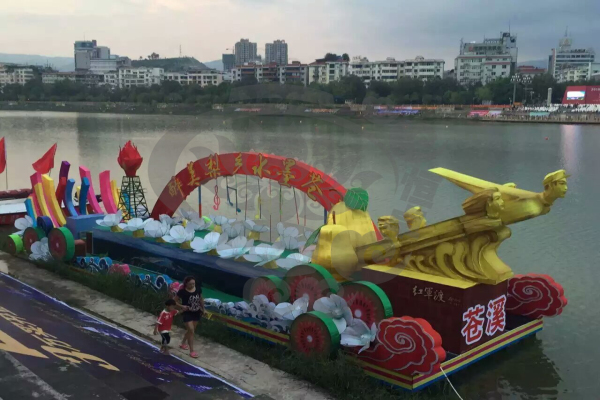 一、以綢布為主要裝飾材料的彩車,用絲骨架造型,其特點是制作工期短,造型豐富且價格較為便宜,這種工藝的彩車應用廣泛,尤其適合使用時間短暫的節慶活動。這種材質的彩車還有個顯著的特點就是透光性好,可以整體內透光,夜間使用美輪美奐。