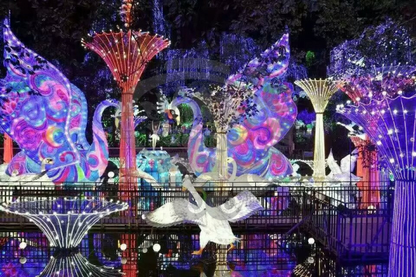 就是自貢燈會與自然環境的完美結合,它將璀璨奪目的燈布展于園林山水中,形成燈景交融、層次迷離的獨特風采。無論是精巧別致的工藝燈,還是宏偉壯觀的大型燈組,都布展于園林山水之中,湖光山色、亭臺水榭與燈融為一體,形成燈中有景、景中有燈,燈景交織的奇妙景觀。觀眾稱之為“燈的山,燈的樹,燈的水,燈的路”。波光水影、風簫聲動,燈景渾然一體,彩燈藝術的人工美與園林山水的自然美珠聯璧合,組成了瓊樓玉亭、層次迷離的美妙世界,展示了燈景渾然,千光萬彩的獨特風采!
