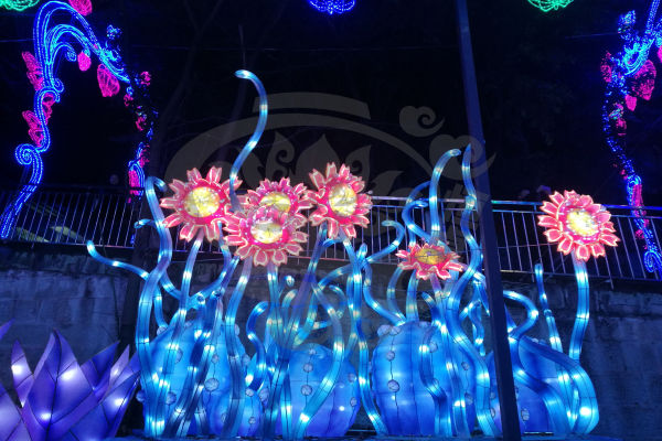 燈會的光不是單一的照明光,這里的光成點、成束、成行、成片。形成“山光水色萬千重,遠近高低各不同”的奇妙景觀,那忽明忽暗的光,給你以神秘和感覺;那紅彤彤的光,喚起你熱切的向往與追求;那水中的光激起五彩光柱,那龍口中噴的光撒下七色星斑。尤其值得一提的是,自貢燈會的光以內光源為主,這光從燈具的“肚子”里透出,使燈更具生命力和感染力。