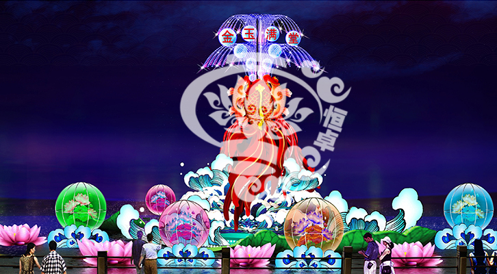 設計說明:燈組以鯉魚為設計主題,配上荷花,浪花,形成一幅美麗的畫面,祝福大家金玉滿堂。恭賀新禧。