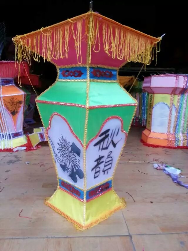 現(xiàn)代宮燈主要以鋼絲為骨架,塑料成型的上下座,和空心鐵桿為支撐,顏色絢麗的布料為主要原料手工制作完成。