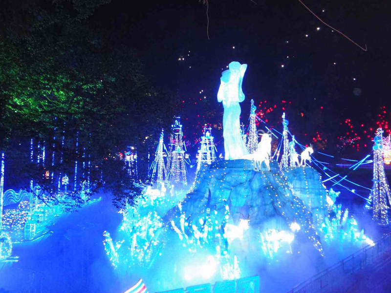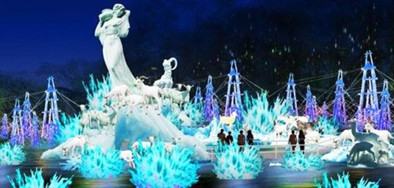 燈組說(shuō)明:整個(gè)場(chǎng)景以“井鹽白”為主基色,清新典雅,高貴純潔。燈組講述了遠(yuǎn)古自流井一個(gè)牧羊女“鹽妹子”和一群牧羊相逢咸泉,開(kāi)掘出鹽晶,至此發(fā)現(xiàn)鹽鹵, 掀開(kāi)了自貢兩千多年因鹽興市的悠久歷史的美麗傳說(shuō)。這一自貢鹽文化的美麗傳說(shuō),感動(dòng)了一代又一代的鹽都人。燈組采用透明玻璃鋼立體造型和手繪粘沙工藝,運(yùn)用LED的變化技術(shù),塑造了端莊的“鹽妹子”、可愛(ài)的小牧羊、神秘而美麗的鹽晶花、聳立的天車(chē)和忙綠的運(yùn)鹽船隊(duì),把天車(chē)林立的鹽場(chǎng),千船待發(fā)的鹽道以及家喻戶(hù)曉的美麗傳說(shuō)真實(shí)而生動(dòng)的再現(xiàn)了出來(lái)。燈組把極為微小的鹽晶體放大幾千倍,刻畫(huà)了其復(fù)雜多紋的分子結(jié)構(gòu),恰似一朵朵美麗盛開(kāi)的花朵,讓人第一次領(lǐng)略了鹽晶的神奇魅力、整個(gè)場(chǎng)面美麗如畫(huà),充滿(mǎn)生機(jī),令人流連忘返。