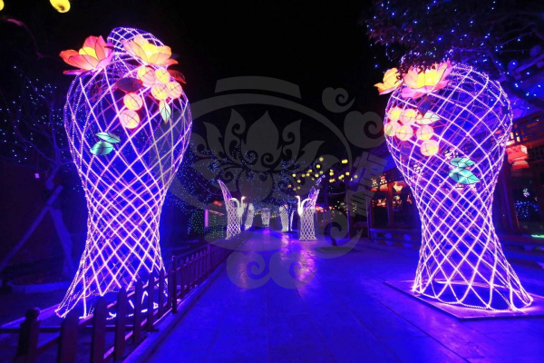 光雕燈是現代藝術彩燈造型的新形式。藝術彩燈利用玻璃、冰塊、透明塑料等透光材料制成各種造型和燈具,光線從內部或外部照射,通過投射光的透射、折射、反射等物理特性的充分發揮,構成光輝燦爛的各種色光的立體藝術。也有利用小型彩色燈泡、燈珠、霓虹燈、光導纖維等燈具材料,直接構成五彩繽紛的燈光圖案畫面。近幾年運用LED 燈帶制作的各種光雕彩燈也展現在燈會中。