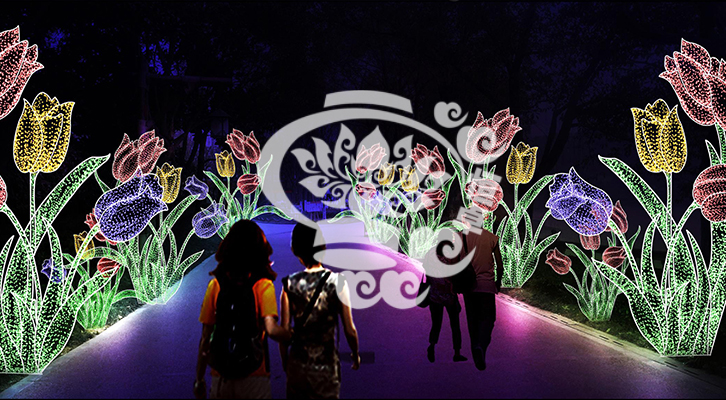 彩燈利用玻璃、冰塊、透明塑料等透光材料制成各種造型和燈具,光線從內部或外部照射,通過投射光的透射、折射、反射等物理特性的充分發揮,構成光輝燦爛的各種色光的立體藝術。也有利用小型彩色燈泡、燈珠、霓虹燈、光導纖維等燈具材料,直接構成五彩繽紛的燈光圖案畫面。近幾年運用LED 燈帶制作的各種光雕彩燈也展現在