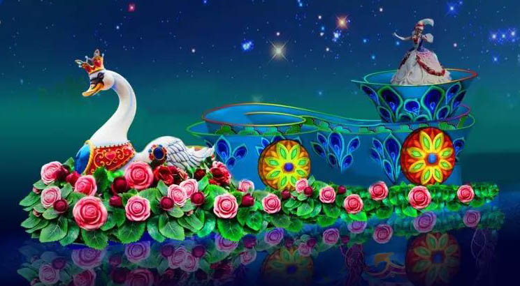 《天鵝公主》長15米高5米寬6米玻璃鋼彩繪花車。此花車氣勢宏偉、色彩斑斕的天鵝公主花車上可站多名舞蹈演員,花車上活動空間較大,演員可靈活走動跟四面八方的游客互動。