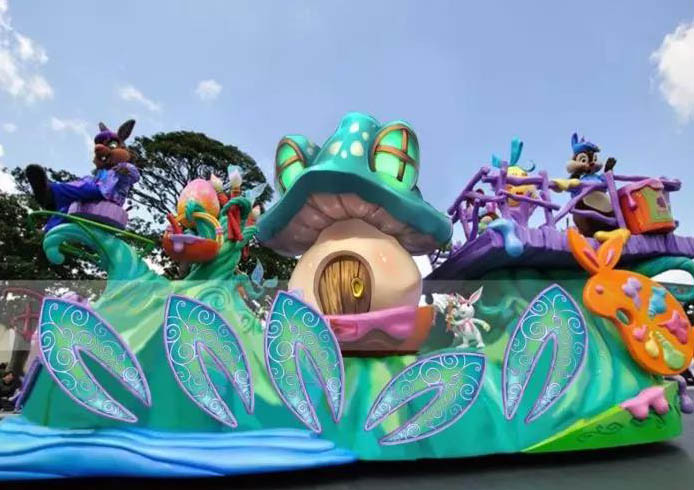 《夢游仙境》長15米高6米寬6米玻璃鋼彩繪花車。城堡是孩子們對童話世界幻想和向往,月亮城堡里呈現出小動物們歡樂玩耍的場景,旋轉木馬,小動物們彈琴歌唱,帶動著游客歡快喜悅的心情。