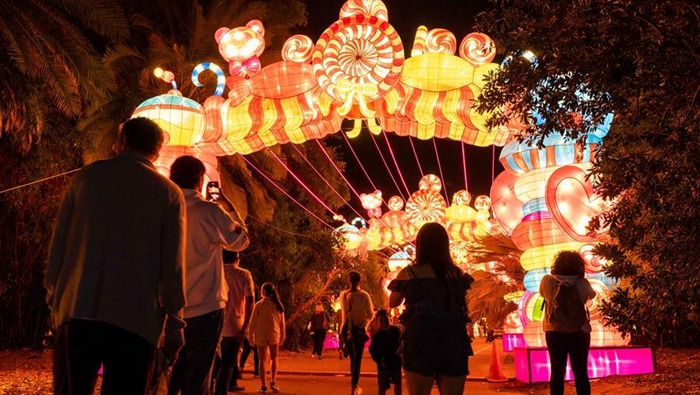10月27日在美國洛杉磯縣植物園舉行“月光森林”燈會,展出數十組彩燈,吸引不少游客前來參觀。