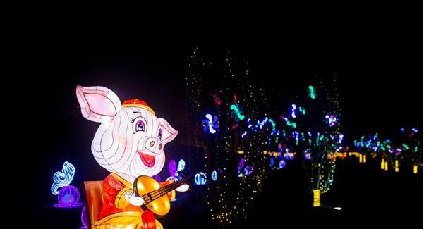 最引人注目的是生肖元素豬年花燈《諸事大吉》。小豬渾身上下金燦燦的,一副憨態可掬的樣子。它肥頭肥腦大耳朵、長嘴巴,一雙黑黝黝的眼睛,十分引人注目。小豬背上還有一個大大的金元寶,一按金元寶,小豬兩個大耳朵就一扇一扇的,還放著金光,微卷的尾巴左右擺動,四只腳有節奏的擺來擺去像是在奔跑。