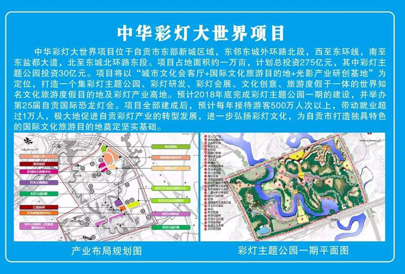 中華彩燈大世界計劃總投資275億元,其中彩燈主題公園投資30億元。項目位于自貢市東部新城區(qū)域,東鄰東城外環(huán)路北段,西至東環(huán)線,南至東鹽都大道,北至東城北環(huán)路東段,占地面積約1萬畝。