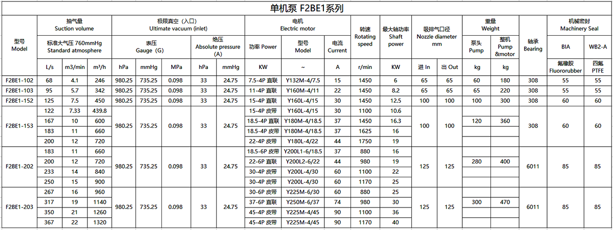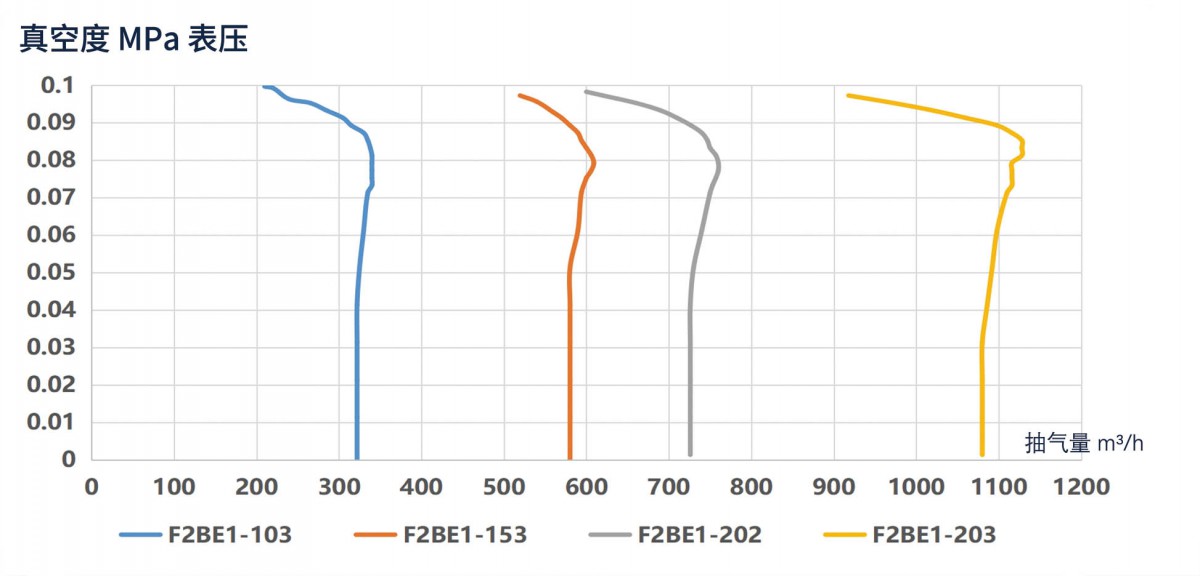 F2BE系列耐腐蝕真空泵可滿足246~1380m3/h的中高抽氣量區(qū)間,其限度真空度也更高。